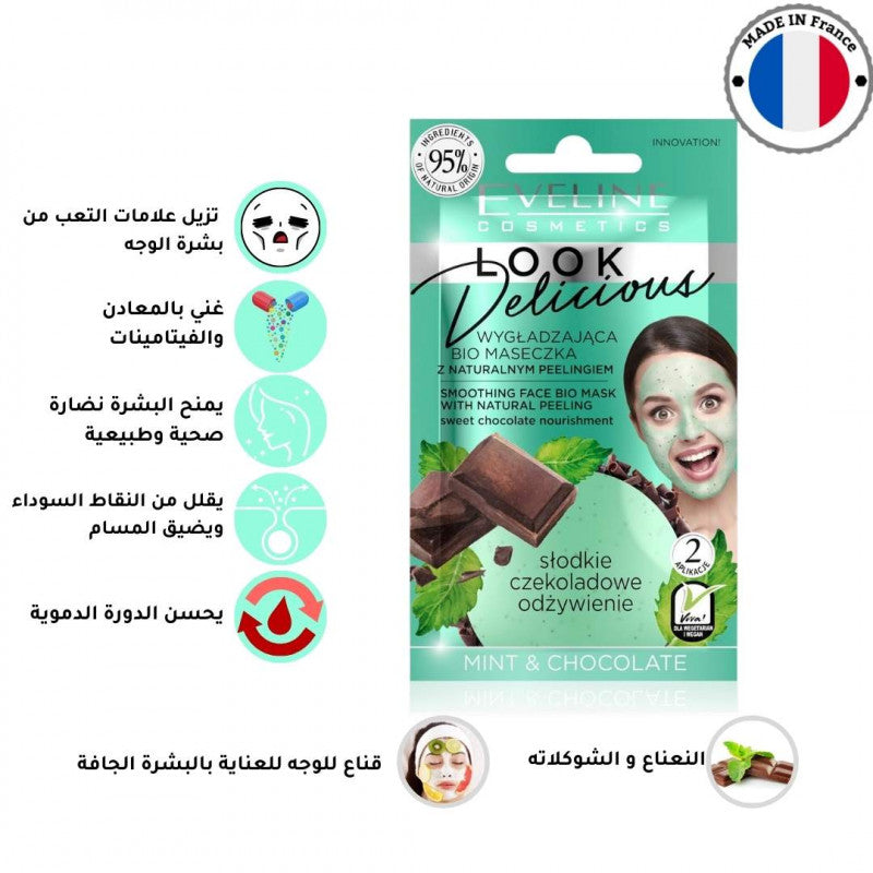 مزيج رائع من الشوكولاتة والنعناع يغذي وينعش بشرتك يترك البشرة مرنة جزيئات التقشير تنقي بشرتك تماماً 95٪ مكونات طبيعية قناع ومقشر في نفس الوقت ينعم ويغذي وينقي الكيس الواحد يكفي مرتين من الاستخدام ارشادات الاستخدام: