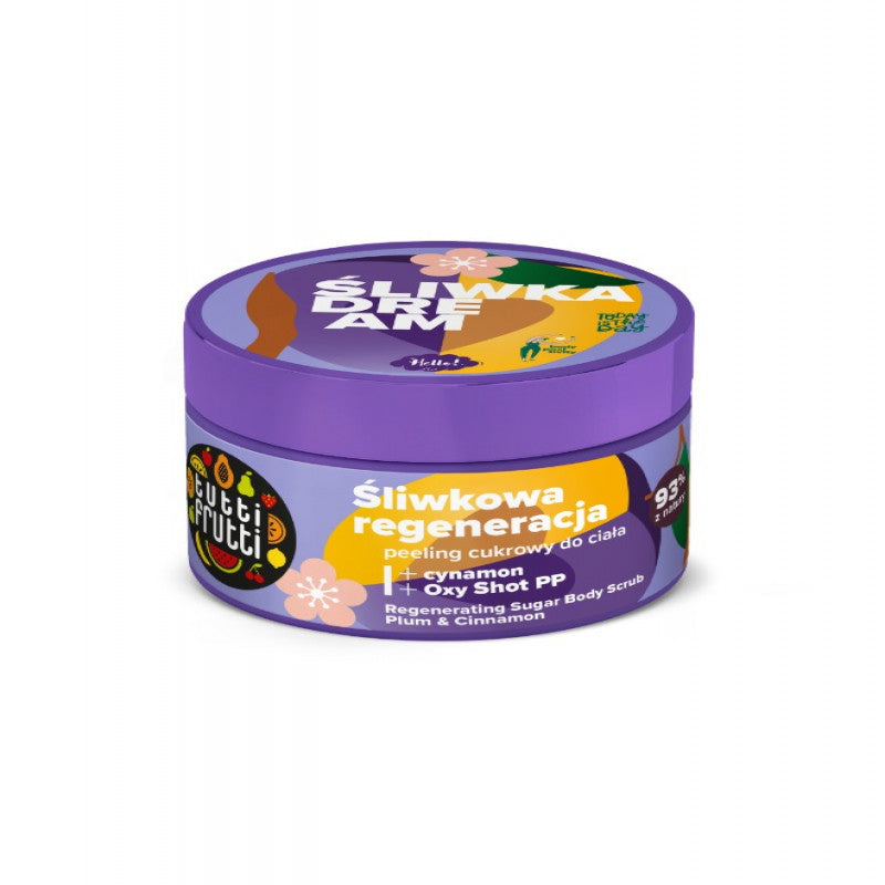 مقشر السكر من توتي فروتي بالبرقوق والقرفة يعمل على تنعيم البشرة بينما تعمل زيوت الفاكهة الطبيعية والفيتامينات A و E و F على إزالة السيلوليت وتحسين لون البشرة،