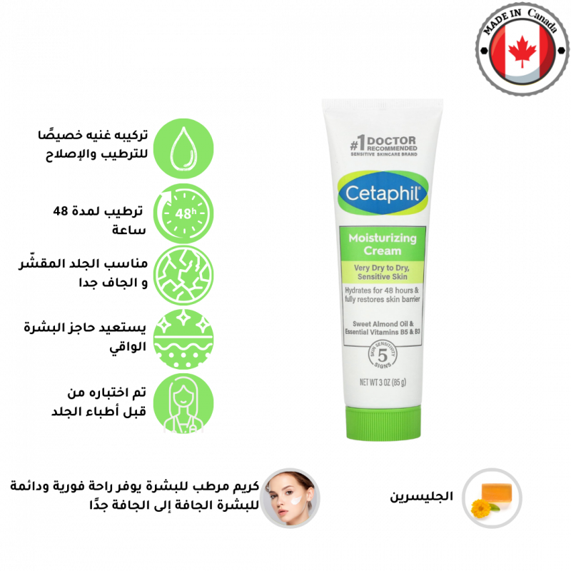 كريم سيتافيل cetaphil المرطب اختيار خبراء الجلدية الأول لترطيب البشرة الحساسة والبشرة شديدة الجفاف وذلك لأنه يوفر ترطيبًا مكثفًا يدوم حتى 48 ساعة، ويوفر ايضًا لبشرتك تحسن كبير في حاجز البشرة بعد 3 أيام من الإستخدام، ويساهم في استعادة الحاجز الواقي للبشرة بعد أسبوع واحد من الإستخدام. تم اختباره من قبل أطباء الجلدية وثبت سريريًا بأنه لطيف على البشرة الحساسة ويساعد على تحسين مرونتها. خالي من العطور والبارابين، لا يسبب تهيج أو انسداد لمسام البشرة.