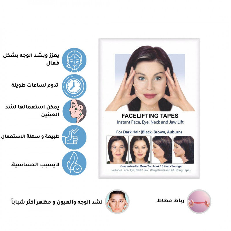 النتيجه تظهر خلال ثواني معدوده، اللصقات ثابته بمكانها لساعات طويله. مع هذه اللصقات يمكنك الأن رفع العين من جهه الحواجب لتصنعي سحبه للعين والحواجب . او الرفع من جهه الخدود لتحديدها . او لشد الرقبه ومنطقة الفك على شكل فك تكساس. يمكن اخفاء الخيوط داخل الشعر، تعتبر حل مؤقت افضل من الأبر، وكانت تستخدم قديما بكثره من قبل نجوم هوليود. تحتوي العلبه على 40 لصقه . 6 خيوط . 2 خيط لمنطقة العيون . 2 خيط لمنطقه الرقبه.