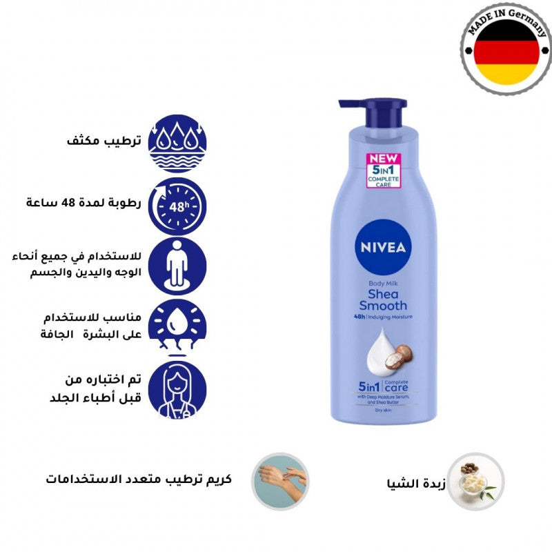 الوصف لوشن الجسم نيفيا المنعم بتركيبة تنعيم خاصة توفر 48 ساعة من العناية بالترطيب للحصول على بشرة أكثر نعومة بشكل ملحوظ بعد استخدام واحد فقط. نيفيا، مائة عام من العناية بالبشرة مدى الحياة! غني بسيروم الترطيب العميق وزبدة الشيا المغذية، يذوب لوشن الجسم من نيفيا برفق في بشرتكِ مما يجعلها ناعمة ونضرة ومريحة.